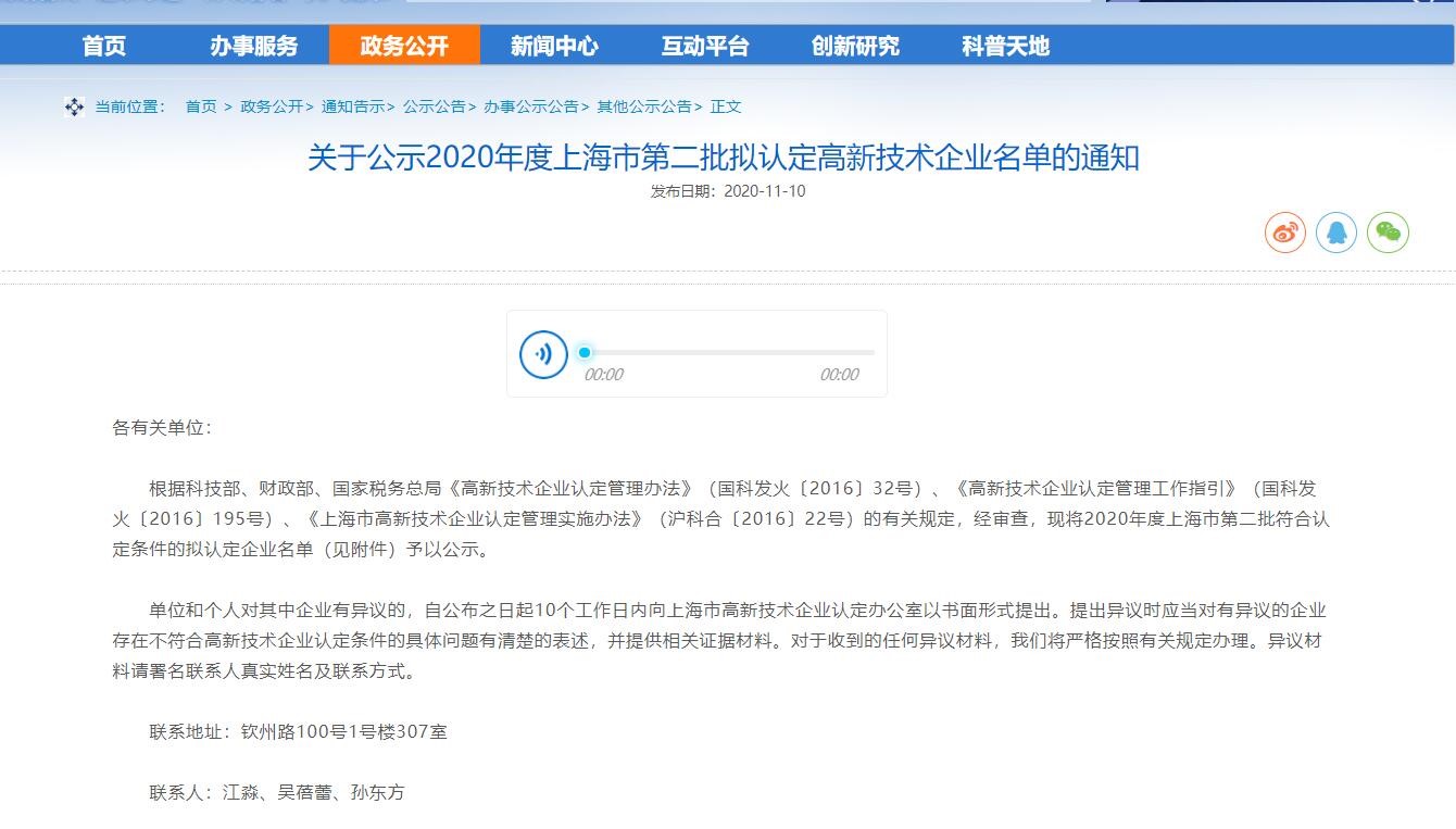 近日,上海市科学技术委员会正式发布2020年度上海市第二批拟认定高新技术企业名单。天韧科技(上海)有限公司凭借互联网科技、智能农险系统、精算科技方面的创新探索,成功入选了“2020年上海市高新技术企业”名单。